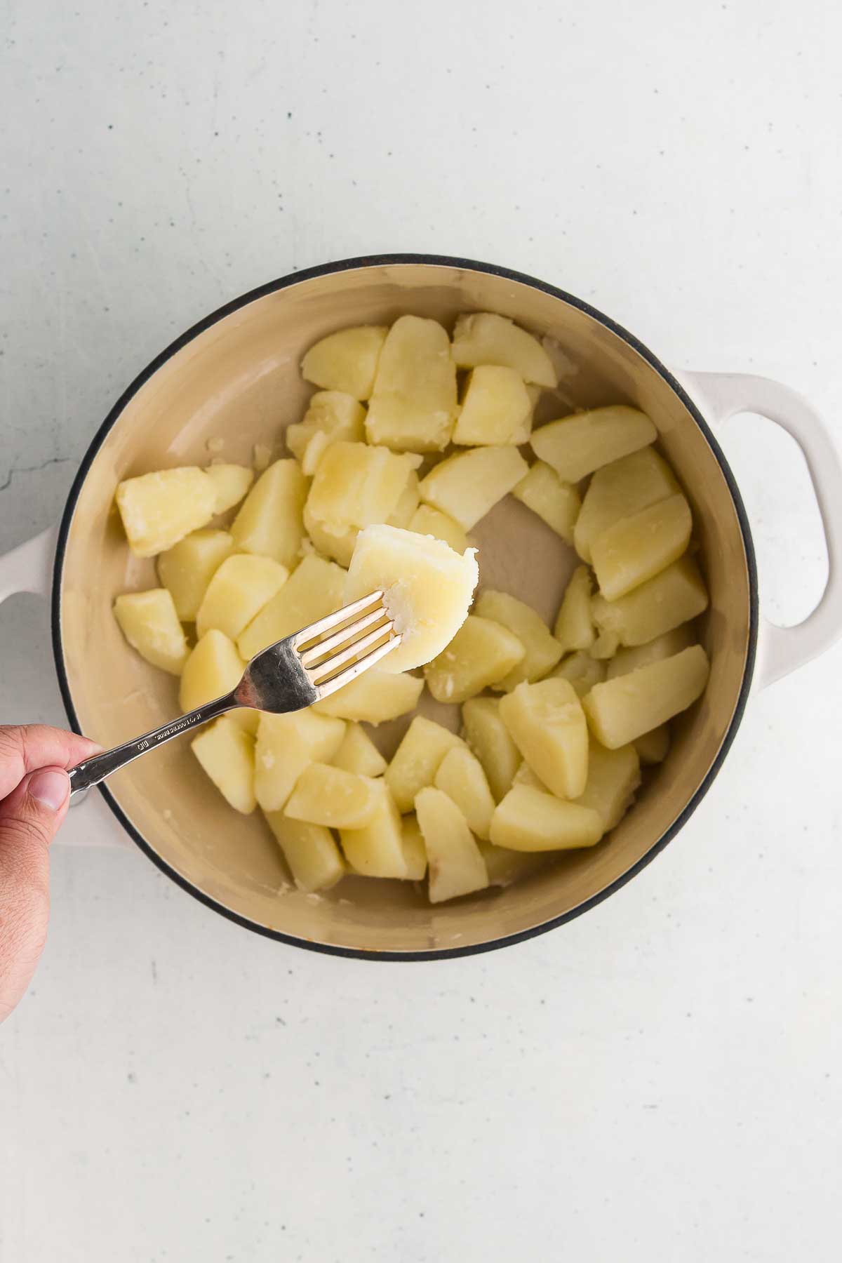 - Fill a large pot halfway with water and place over high heat. Bring to a boil and carefully add potato chunks. Boil until fork-tender, about 15 minutes. Drain in a colander and set aside.