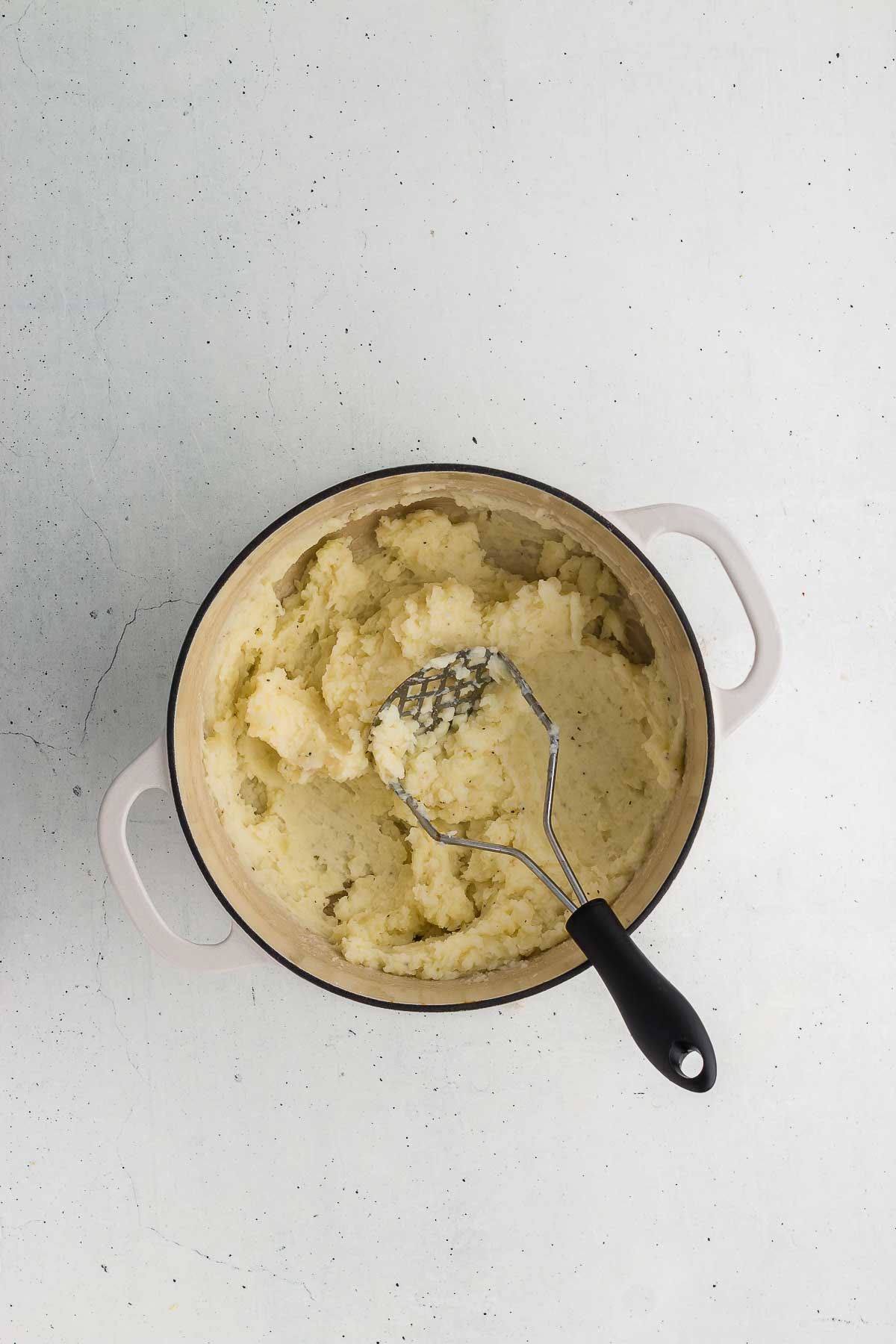 - Place the potatoes back into the pot they were boiled in. Add the milk, 3 tablespoons butter, 1 teaspoon salt, and 1/4 teaspoon ground pepper. Use a potato masher to mash the potatoes together, adding another splash milk if needed.